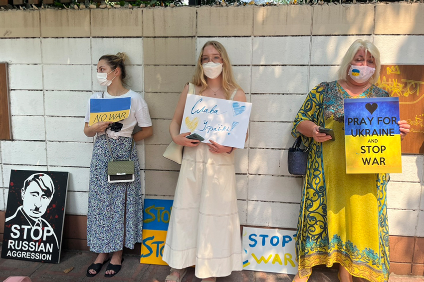 วันนี้ (1 มี.ค. 65) มีการชุมนุมของชาวยูเครนและผู้สนับสนุนยูเครนที่พำนักอยู่ในประเทศไทย บริเวณด้านหน้าสถานทูตสหพันธรัฐรัสเซีย เขตบางรัก หนึ่งในนั้นคือหญิงชาวรัสเซียสวมเสื้อ “I Stand With Ukraine” (เรายืดหยัดร่วมกับยูเครน)