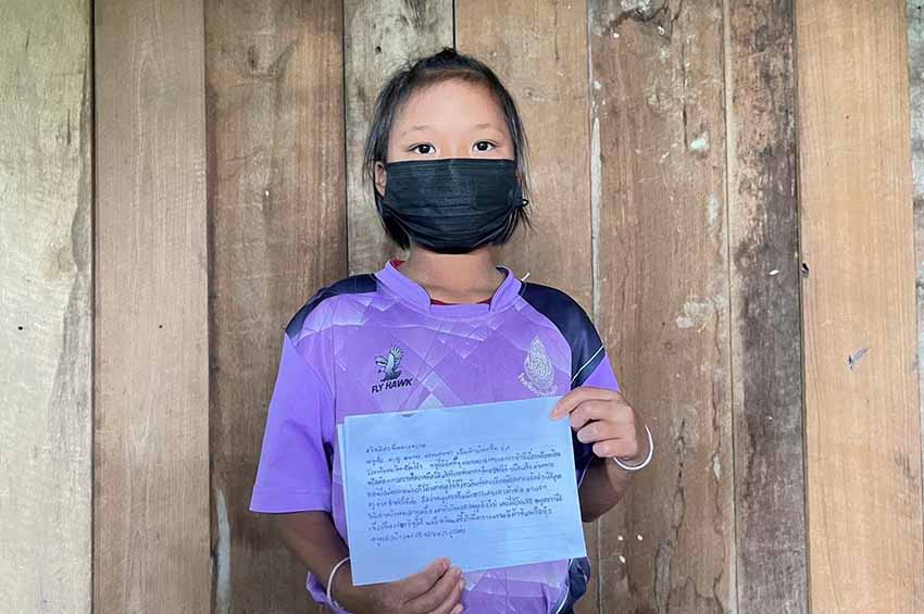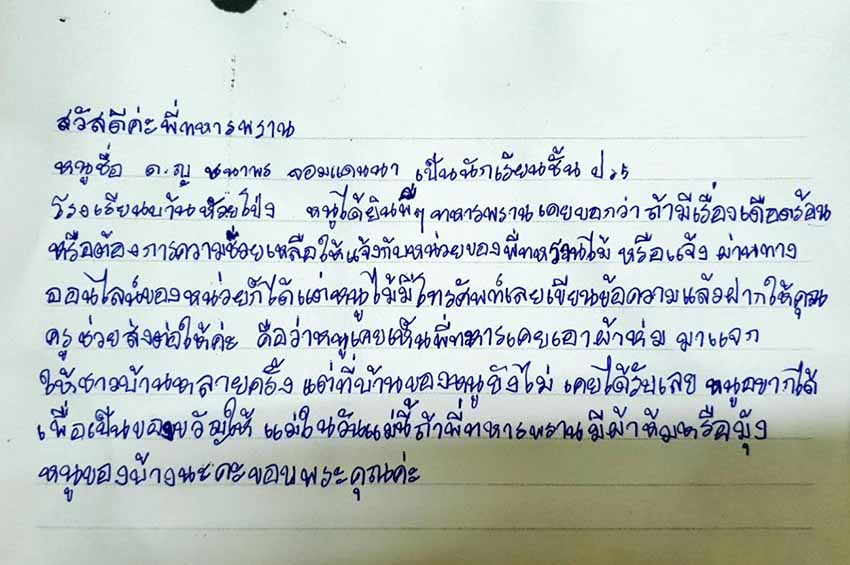 “หนูชื่อ ด.ญ.ชนาพร จอมแดนนา เป็นนักเรียนชั้น ป.5 โรงเรียนบ้านห้วยโป่ง เคยได้ยินพี่ๆ ทหารพรานเคยบอกว่าถ้ามีเรื่องเดือดร้อนหรือต้องการความช่วยเหลือให้แจ้งกับหน่วยของพี่ทหาร ผ่านทางออนไลน์ของหน่วยก็ได้ แต่หนูไม่มีโทรศัพท์เลยเขียนข้อความแล้วฝากให้คุณครูช่วยส่งต่อให้ค่ะ คือว่าหนูเคยเห็นพี่ทหารเคยเอาผ้าห่ม มาแจกให้ชาวบ้านหลายครั้ง แต่ที่บ้านของหนูยังไม่เคยได้รับเลย หนูอยากได้เพื่อเป็นของขวัญให้ แม่ในวันแม่นี้ถ้าพี่ทหารพรานมีผ้าห่มหรือมุ้งหนูขอบ้างนะคะขอบคุณคะ”