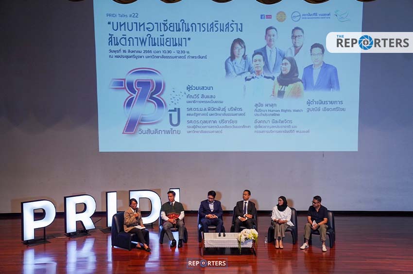 วันนี้ (16 ส.ค. 66) ที่หอประชุมศรีบูรพา มหาวิทยาลัยธรรมศาสตร์ ท่าพระจันทร์ สถาบันปรีดี พนมยงค์ จัดเสวนา “บทบาทอาเซียนในการเสริมสร้างสันติภาพในเมียนมา” แลกเปลี่ยนแนวทางการสร้างสันติภาพในเมียนมา ภายหลังการรัฐประหารโดยรัฐบาลทหารเมียนมา โดย นายกัณวีร์ สืบแสง สส.แบบบัญชีรายชื่อ และเลขาธิการพรรคเป็นธรรม, รศ.ดร.ดุลยภาค ปรีชารัชช รองผู้อำนวยการสถาบันเอเชียตะวันออกศึกษา มหาวิทยาลัยธรรมศาสตร์, รศ.ดร.ม.ล.พินิตพันธุ์ บริพัตร อาจารย์ประจำสาขาการระหว่างประเทศ คณะรัฐศาสตร์ มหาวิทยาลัยธรรมศาสตร์, นายสุนัย ผาสุก ที่ปรึกษา Human Rights Watch ประจำประเทศไทย