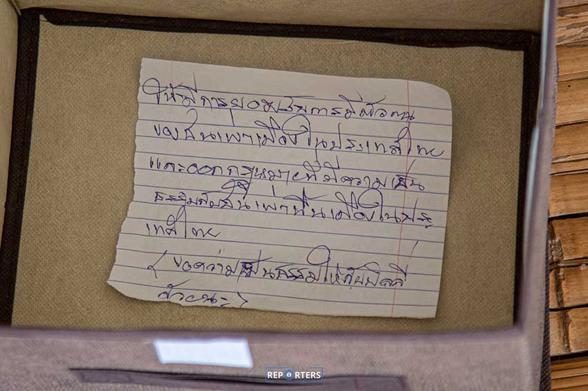 จุไรรัตน์ ก็เลือกที่จะเขียนข้อความเป็นภาษาไทยในกระดาษทั้งสองหน้า โดยระบุว่า ”เราอยากกลับไปที่บางกลอยบน กลับไปที่ดั้งเดิมที่พ่อแม่เคยอยู่ เราอยู่บางกลอยมีความสุข ไม่เหมือนที่นี่วุ่นวาย“ ส่วนอีกหน้าเธอเขียนว่า แม้บิลลี่ไม่มีชีวิตอยู่แล้ว แต่เราก็ไม่เคยลืมที่จะคิดถึงเขา เรากลับมาที่นี่ไม่เห็นที่ดั้งเดิมเหมือนแต่ก่อน เจอแต่สิ่งใหม่ ๆ เราอยากกลับไปทำกินดั้งเดิมอยู่บางกลอยล่างไม่มีที่ดินทำกิน ลำบาก เราต้องการไร่หมุนเวียนที่ดั้งเดิม“