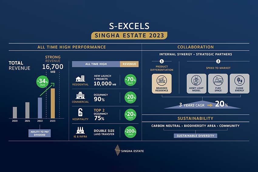 “ในปี 2566 เป็นปีที่สำคัญมากของสิงห์ เอสเตท กลยุทธ์ “S EXCELS” คือการสร้างความเป็นเลิศในทุกมิติ มิติแรก คือ ผลการดำเนินงานที่เป็นเลิศ ดันเป้ากำไรสู่ All-time High ในทุกพอร์ตธุรกิจ โดยปีนี้จะสามารถสร้างรายได้รวม ของบริษัทให้เติบโตขึ้นสูงถึง 34% หรือมีมูลค่าแตะ 16,700 ล้านบาท มิติที่สองคือการเพิ่มแต้มต่อธุรกิจ เสริมแกร่งศักยภาพในการแข่งขัน เน้นการสร้าง Synergy ที่เกื้อหนุนกันระหว่าง 4 ธุรกิจ และความร่วมมือกับพันธมิตรชั้นนำ เพื่อสร้างการเติบโตเฉลี่ยปีละ 20% ตลอด 3 ปี มิติที่สามคือ การพัฒนาอย่างยั่งยืน บริษัทฯ ตั้งเป้าบรรลุความเป็นกลางทางคาร์บอนในปี 2573 และกำหนดแผนอนุรักษ์ในพื้นที่ที่มีความหลากหลายทางชีวภาพในบริเวณธุรกิจตั้งอยู่”