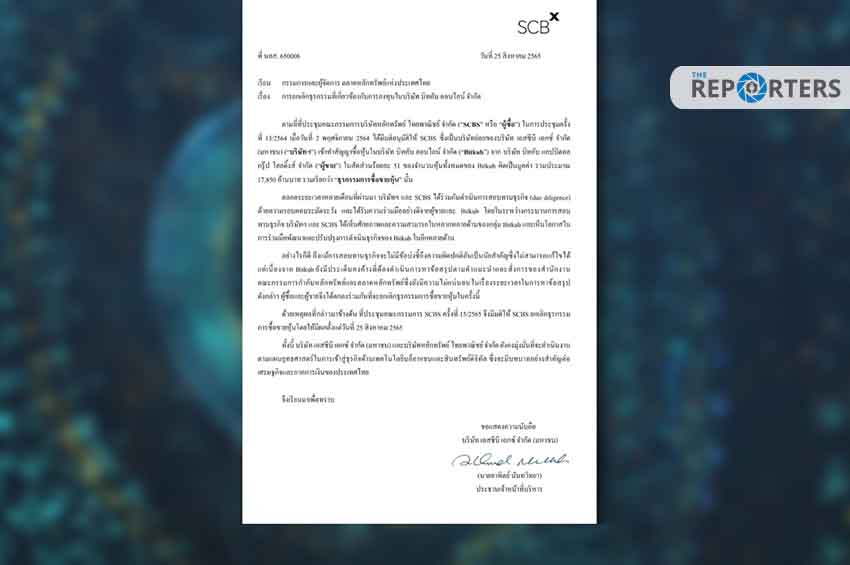 โดยมีเนื้อหาสรุปว่า ตามที่ที่ประชุมได้มีมติอนุมัติให้ SCBS เข้าทำสัญญาซื้อหุ้น ในบริษัทบิทคับ ออนไลน์ จำกัด (“Bitkub”) จาก บริษัท บิทคับ แคปปิ ตอล กรุ๊ป โฮลดิ้งส์ จำกัด ในสัดส่วน 51% ของจำนวนหุ้น ท้ังหมดของ Bitkub คิดเป็นมูลค่า รวมประมาณ 17,850 ล้านบาท นั้น ในช่วงที่ผ่านมาได้สอบทานธุรกิจ (due diligence) ด้วยความรอบคอบระมัดระวัง โดยในระหว่างกระบวนการสอบทานธุรกิจ เห็นศักยภาพและความสามารถในหลากหลายด้านของกลุ่ม Bitkub และเห็นโอกาสใน การร่วมมือพัฒนาและปรับปรุงการดำเนินธุรกิจของ Bitkub ในอีกหลายด้าน