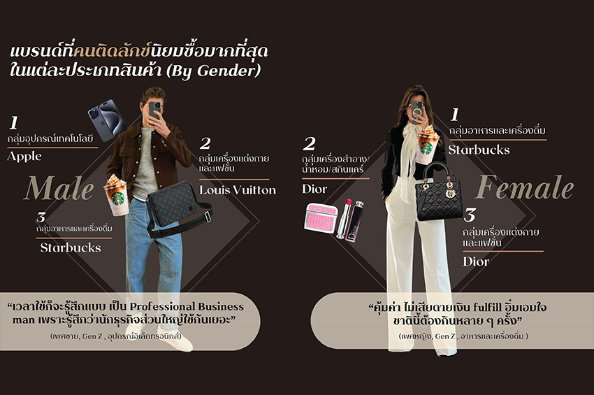 สำหรับแบรนด์ที่ผู้ชายติดลักซ์นิยมซื้อมากที่สุด 3 อันดับแรก ได้แก่ Apple (กลุ่มอุปกรณ์เทคโนโลยี) Louis Vuitton (กลุ่มเครื่องแต่งกาย และแฟชั่น) และ Starbucks (กลุ่มอาหาร และเครื่องดื่ม) สำหรับผู้หญิง ได้แก่ Starbucks (กลุ่มอาหาร และเครื่องดื่ม) Dior (กลุ่มเครื่องสำอาง/น้ำหอม/สกินแคร์) และ Dior (กลุ่มเครื่องแต่งกาย และแฟชั่น)