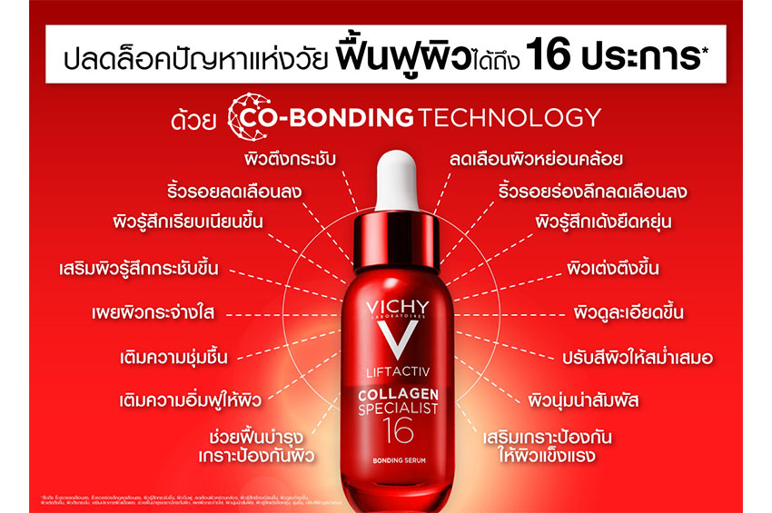 Vichy Laboratoires (วิชี่) แบรนด์เวชสำอางชั้นนำผู้บุกเบิกวิทยาศาสตร์เอ็กซ์โปโซมผิวหนังจากประเทศฝรั่งเศส ภายใต้เครือลอรีอัล กรุ๊ป เปิดตัว “Co-bonding Technology” จากทุ่มเทวิจัยนานกว่า 15 ปี พร้อมส่ง “Vichy Liftactiv Collagen Specialist 16 – Bonding Serum” เพื่อปลดล็อคปัญหาผิวแห่งวัย 16 ประการ* สู่ยุคใหม่ของผิวดูอ่อนเยาว์และสุขภาพดีอย่างแท้จริง ตอกย้ำความมุ่งมั่นคิดค้นนวัตกรรมเพื่อผิวดูสุขภาพดีอย่างยั่งยืน