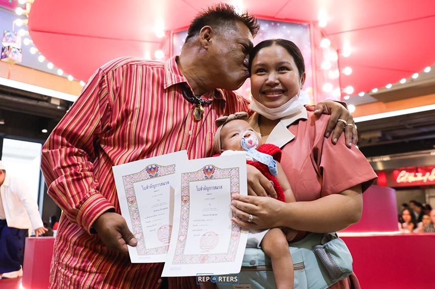 นอกจากนี้ยังมีคู่ชาย-หญิง ที่มาจดทะเบียนสมรสในงานด้วย โดยนายปรีดา จันทร์ฉวี และนางสาวปาวีนา จันทะวงสา อุ้มลูกน้อยวัย 1 เดือน มาจดทะเบียนสมรส นายปรีดา เปิดเผยว่า 14 กุมภาพันธ์ ถือเป็นฤกษ์ดีตั้งใจว่าจะมาจดทะเบียนสมรสวันนี้ เพราะเป็นวันแห่งความรัก ส่วนนางสาวปาวีนา เล่าด้วยรอยยิ้มว่ารักของเธอคือ พรหมลิขิต เราต่างอายุ ต่างวัย อยู่ห่างไกลกันแต่ก็ยังมาเจอกันและรักกันมานาน 3 ปี เช่นเดียวกับชื่องานรักไม่มีพรมแดน