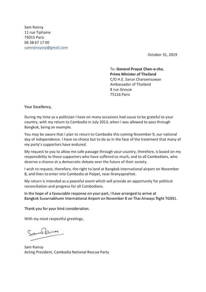 พล.อ.ประยุทธ์ จันทร์โอชา นายกรัฐมนตรี และรัฐมนตรีว่าการกระทรวงกลาโหม กล่าวถึงกรณีนายสม รังสี อดีตผู้นำฝ่ายค้านของกัมพูชา ทำหนังสือขอผ่านไทยกลับเข้าประเทศกัมพูชาว่า คงไม่ได้เข้ามาในไทย เพราะตามมติของอาเซียนจะไม่ยุ่งกิจการภายในซึ่งกันและกันและไม่ยอมให้ผู้ต่อต้านรัฐบาลมาใช้พื้นที่ไทยในการเคลื่อนไหวซึ่งได้สั่งการลงไปแล้ว และไม่ได้มีการตอบกลับหนังสือกับนายสม รังสีแต่อย่างใด