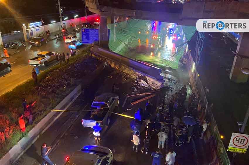 ขณะที่เกิดเหตุ เจ้าหน้าที่คุมงานและคนงาน อยู่ระหว่างเตรียมความเรียบร้อยพื้นที่เพื่อจะเทพื้นสะพานใหม่ หลังจากที่ได้ทุบพื้นสะพานช่วงที่ชำรุดเสียหายออกแล้ว ทันใดนั้นคานสะพานลอยตัวริมสุดได้ร่วงหล่นลงมาทับรถยนต์ที่สัญจรบนถนนพระราม 2 เป็นเหตุให้มีรถได้รับความเสียหายจำนวน 3 คัน มีผู้เสียชีวิต 2 ราย และมีผู้ได้รับบาดเจ็บ 2 ราย (ประชาชนในรถเกิดเหตุ เสียชีวิต 1 ราย บาดเจ็บ 1 ราย และเจ้าหน้าที่กรมทางหลวง เสียชีวิต 1 ราย บาดเจ็บ 1 ราย) ซึ่งได้ประสานให้เจ้าหน้าที่กู้ภัยนำส่งโรงพยาบาลแล้ว ทั้งนี้ได้ปิดช่องจราจรช่องทางหลัก (ขาเข้า) โดยให้วิ่งทางคู่ขนานแทน เพื่ออำนวยความสะดวกให้กับผู้ใช้ทาง