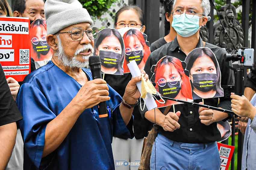 นายสุชาติ เป็นตัวแทนอ่านจดหมายเปิดผนึกถึงประธานศาลฎีกา ใจความว่า ตามที่บุ้ง และใบปอ สองนักกิจกรรมจากกลุ่มทะลุวัง ได้ทำโพลสำรวจความเห็น “ขบวนเสด็จสร้างความเดือดร้อนหรือไม่ ?” เป็นเหตุให้บุ้งและใบปอถูกกล่าวหาว่ากระทำผิดตามประมวลกฎหมายอาญามาตรา 112 และถูกคุมขังอยู่ที่ทัณฑสถานหญิงกลาง ตั้งแต่วันที่ 3 พ.ค.65 โดยทั้งสองได้แสดงจุดยืนต่อศาลที่มีคำสั่งไม่ให้สิทธิประกันตัว ด้วยการอดอาหารมาแล้ว 61 วัน และถูกคุมขังมาแล้ว 91 วัน จนร่างกายเผชิญภาวะวิกฤต