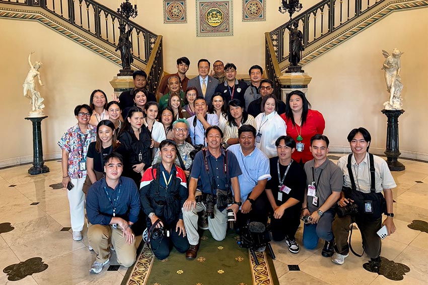 นายกรัฐมนตรี เรียกสื่อฯ เข้าตึกไทยคู่ฟ้า หลังฝนตก ร่วมพูดคุย – ถ่ายภาพหมู่ เผย ’บวรศักดิ์‘ แนะนำ ตั้งฉัตรทอง 7 ชั้น ครอบนรสิงห์ เพื่อความร่มเย็นเป็นสุข มีสง่าราศี ด้านเจ้าหน้าที่ ทำเนียบฯ ขยับรูป อดีตนายกฯ เตรียมติดรูป ’แพทองธาร’
