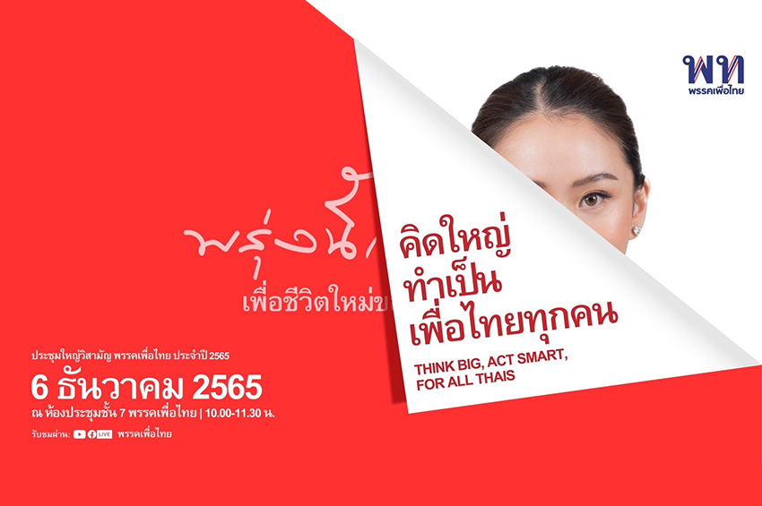 วันนี้ (1 ธ.ค. 65) พรรคเพื่อไทย นำโดย นพ.ชลน่าน ศรีแก้ว ส.ส. น่าน หัวหน้าพรรคเพื่อไทย นายประเสริฐ จันทรรวงทอง ส.ส. นครราชสีมา เลขาธิการพรรคเพื่อไทย และ นางสาวธีรรัตน์ สำเร็จวาณิชย์ ส.ส. กทม. โฆษกพรรคเพื่อไทย ร่วมแถลงข่าว ณ ที่ทำการพรรคเพื่อไทย เกี่ยวกับการจัดประชุมใหญ่วิสามัญ ประจำปี 2565 ในวันอังคารที่ 6 ธันวาคม 2565 ณ หอประชุมชั้น 7 พรรคเพื่อไทย