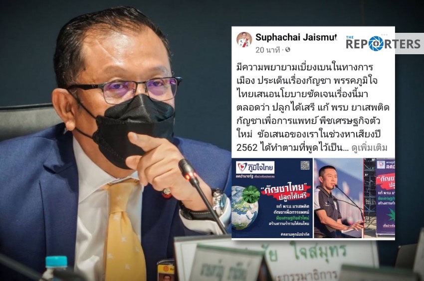 วันนี้ (2 ธ.ค. 65) ที่เฟซบุ๊ก นายศุภชัย ใจสมุทร ส.ส.บัญชีรายชื่อ พรรคภูมิใจไทย ในฐานะประธานคณะกรรมาธิการ (กมธ.) วิสามัญพิจารณา ร่างพ.ร.บ.กัญชา กัญชง (ฉบับที่…) พ.ศ. ได้โพสต์รูปภาพป้ายหาเสียงของพรรคในปี 2562 ซึ่งด้านในปรากฏข้อความว่า
