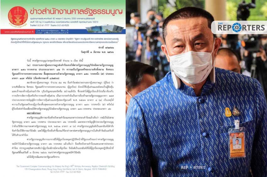 ศาลรัฐธรรมนูญพิจารณากรณีให้ผู้ถูกร้องหยุดปฏิบัติหน้าที่รัฐมนตรีจนกว่าศาลรัฐธรรมนูญ จะมีคําวินิจฉัยตามรัฐธรรมนูญ มาตรา 82 วรรคสอง แล้วเห็นว่า ข้อเท็จจริงตามคําร้องและเอกสารประกอบคําร้อง ปรากฏเหตุอันควรสงสัยว่าผู้ถูกร้องมีกรณีตามที่ถูกร้อง จึงมีมติเป็นเอกฉันท์สั่งให้ผู้ถูกร้องหยุดปฏิบัติหน้าที่รัฐมนตรีตั้งแต่วันที่ 3 มีนาคม 2566 จนกว่าศาลรัฐธรรมนูญจะมีคําวินิจฉัยแจ้งให้คู่กรณีและนายกรัฐมนตรีทราบ