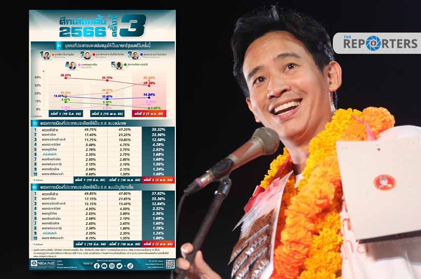 นิด้าโพลโค้งสุดท้าย ความนิยม ‘พิธา’ แซง ‘อุ๊งอิ๊ง’ ความนิยมก้าวไกลขยับจ่อเพื่อไทย พล.อ.ประยุทธ์ อันดับ 3 นับถอยหลัง 12 วันสู่การเลือกตั้ง