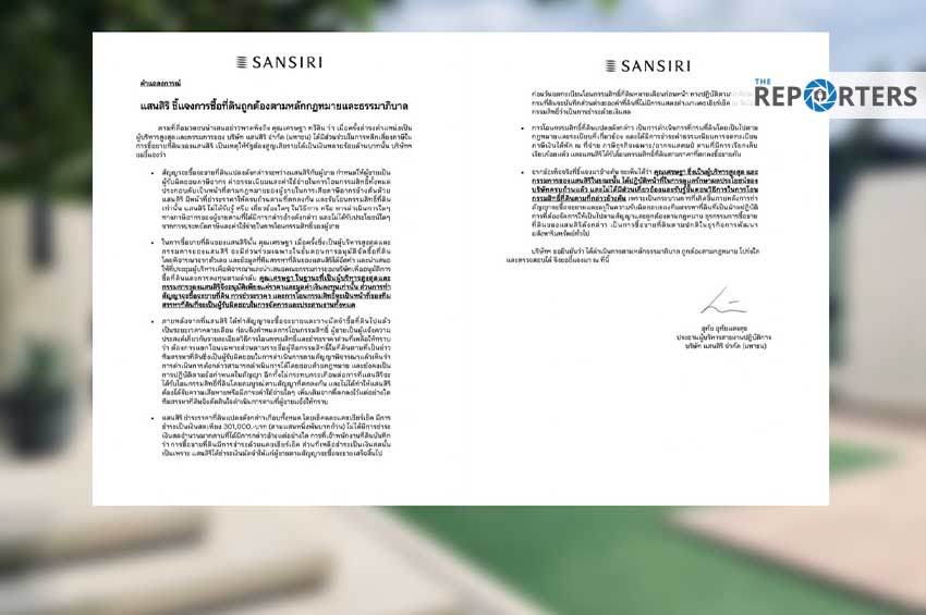 นายอุทัย อุทัยแสงสุข ประธานผู้บริหารสายงานปฏิบัติการ บริษัท แสนสิริ จำกัด (มหาชน) ออกแถลงการณ์ชี้แจงการซื้อที่ดินถูกต้องตามหลักกฎหมายและธรรมาภิบาล โดยระบุว่า
