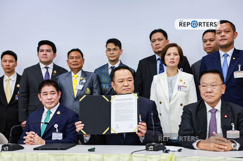 ”พรรคภูมิใจไทยเป็นตัวแทน เพราะเราเป็นแกนนำในการจัดตั้งรัฐบาล จะเป็นไปตามเงื่อนไขทั้ง 5 ข้อ ที่ท่านหัวหน้าพรรคณัฐพงษ์ได้แถลงไปเมื่อเช้านี้ ผมจะลงนาม ณ บัดนี้“