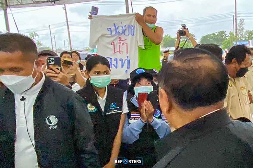 จังหวะหนึ่งมีประชาชนชูเสื้อ เขียนข้อความว่า “ปล่อยน้ำลงทุ่ง” พร้อมตะโกนบอก พล.อ.ประวิตร ให้สั่งการให้มีการปล่อยน้ำเข้าทุ่ง “ช่วยชาวบ้านหน่อยนะครับ ปล่อยน้ำเข้าทุ่งหน่อยครับ ช่วยชาวบ้านหน่อยนะครับ ขอบคุณครับที่มาช่วยชาวบ้าน” พล.อ.ประวิตร ยิ้มและไม่ได้ตอบอะไร