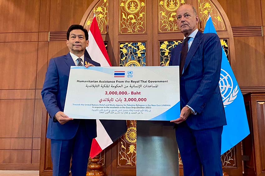 วันนี้ (3 พ.ย.66) นายปานปรีย์ พหิทธานุกร รองนายกรัฐมนตรี และรัฐมนตรีว่าการกระทรวงการต่างประเทศ มอบเงินช่วยเหลือให้แก่สำนักงานบรรเทาทุกข์และจัดหางานของสหประชาชาติ สำหรับผู้ลี้ภัยปาเลสไตน์ในตะวันออกใกล้ (United Nations Relief and Works Agency for Palestine Refugees in the Near East: UNRWA) จำนวน 3,000,000 บาท โดยมี นายจูเซ็ปเป้ เด วินเซ็นทิส ผู้แทนข้าหลวงใหญ่ผู้ลี้ภัยแห่งสหประชาชาติประจำประเทศไทย เป็นผู้รับมอบ