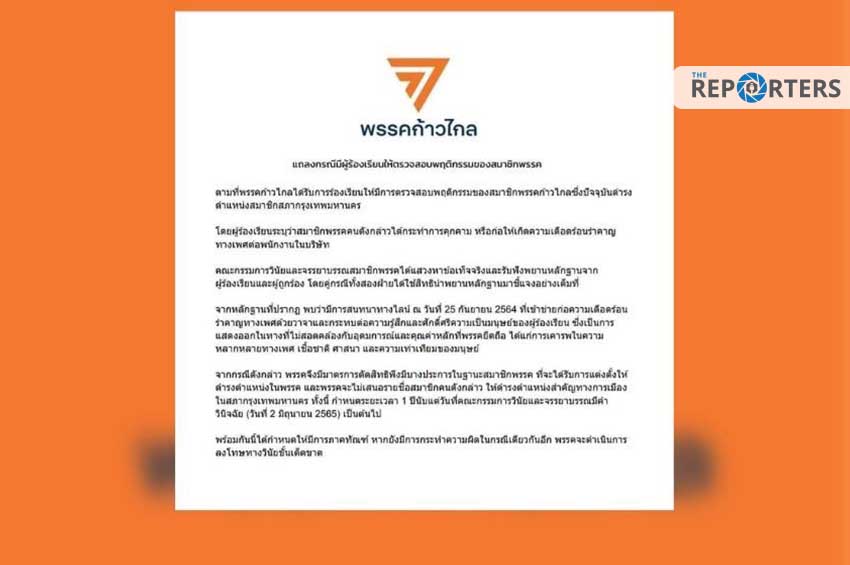 ‘ก้าวไกล’ สั่งลงโทษ ส.ก. คุกคามทางเพศ ตัดชื่อเข้ารับตำแหน่งในพรรค-สภา กทม.