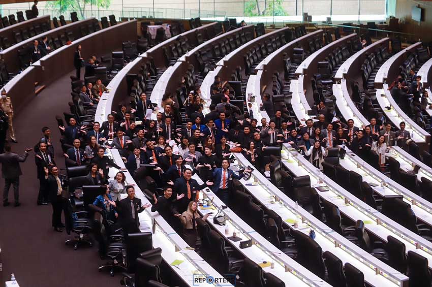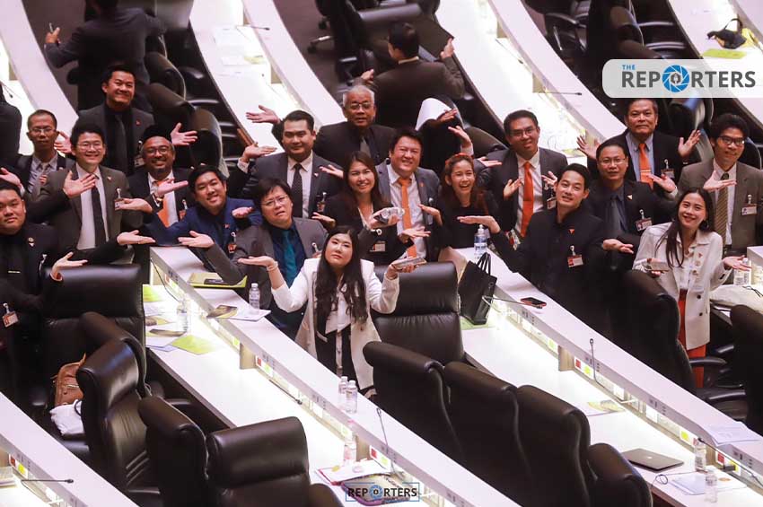 บรรดาสมาชิกสภาผู้แทนราษฎร พรรคก้าวไกล ซึ่งเป็นกลุ่มที่ยกมือรับรองการเสนอญัตติดังกล่าว ต่างทำท่าทาง หงายมือขึ้นสองข้าง เสมอไหล่ พร้อมสีหน้าสุดเซ็ง ที่เกิดการปิดประชุมรัฐสภา