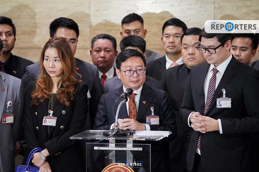วันนี้ (4 ส.ค. 66) ที่อาคารรัฐสภา นายชัยธวัช ตุลาธร เลขาธิการพรรคก้าวไกล และสมาชิกสภาผู้แทนราษฏร (สส.) จากพรรคก้าวไกล แถลงข่าวต่อสื่อมวลชน ภายหลังจากประธานรัฐสภาใช้อำนาจตามข้อบังคับการประชุมที่ 22 เลื่อนการประชุมรัฐสภาในวันนี้ไปก่อน และสั่งปิดการประชุม