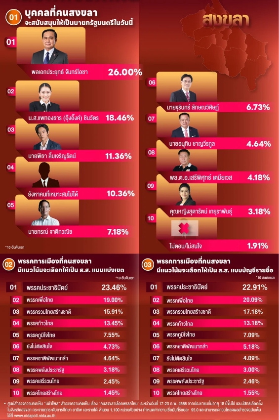 นิด้าโพล เปิดเผยผลสำรวจ ‘คนสงขลา’ พบ พลเอกประยุทธ์ มาวิน นายกฯ ที่คนสงขลาจะสนับสนุน ตามด้วย แพทองธาร และ พิธา ส่วน ส.ส. ทั้งแบ่งเขต และบัญชีรายชื่อ ประชาธิปัตย์ มาที่ 1 ทั้งคู่