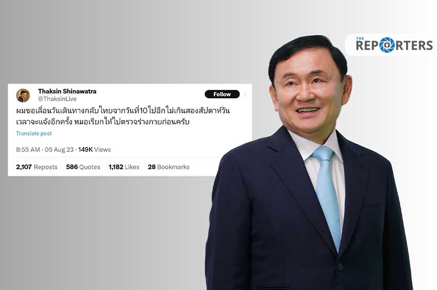 POLITICS ‘ทักษิณ’ ประกาศเลื่อนกลับไทยจากวันที่ 10 ไปอีกสองสัปดาห์ วันนี้ (5 ส.ค.66) นายทักษิณ ชินวัตร อดีตนายกรัฐมนตรี ทวีตข้อความผ่าน X (ทวิตเตอร์) ส่วนตัว “ThaksinLive” ระบุว่า “ผมขอเลื่อนวันเดินทางกลับไทยจากวันที่ 10 ไปอีกไม่เกินสองสัปดาห์วันเวลาจะแจ้งอีกครั้ง หมอเรียกให้ไปตรวจร่างกายก่อนครับ” Tags: ThaksinLive ทวิตเตอร์ ทักษิณ ชินวัตร เลื่อนกลับไทย แนะแนวเรื่อง Previous Previous post: กินสมุนไพรและผักผลไม้พื้นบ้าน ลดไขมัน-น้ำตาลในเลือด ห่างไกลโรค NCDNext Next post: ‘ธนกร’ สยบข่าวลือ ยัน ‘สุชาติ’ ยังอยู่ รทสช.ไม่ทิ้งพรรค Related Posts ‘อนุทิน’ ยัน ไม่โหวตคว่ำงบฯ 69 มองอนาคตชัด เชื่อรัฐบาลอยู่ครบเทอม ‘ไผ่ ลิกค์’ ยัน เพื่อไทย – พลังประชารัฐ ไม่ได้มีปัญหากันตามที่สื่อนำเสนอ ‘วรวัจน์’ เผย พรรคร่วมฯ เตรียมเคาะเก้าอี้ ครม. ใหม่ ก่อนโหวตนายกฯ 1 วัน