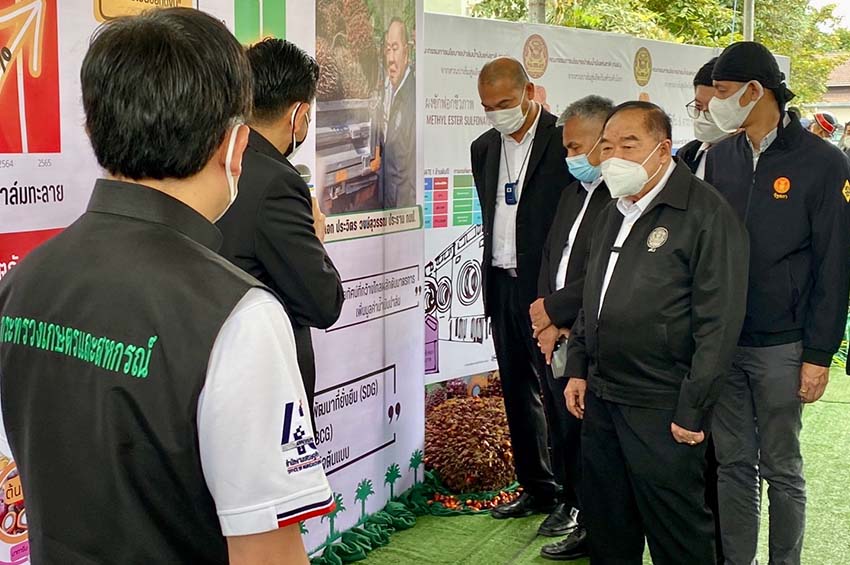 จากนั้น พล.อ.ประวิตร ได้พบกับกลุ่มเกษตรกรชาวสวนปาล์มจากจังหวัดกระบี่ ชุมพร สุราษฎร์ธานี พังงาและนครศรีธรรมราช พร้อมติดตามแผนการเพิ่มมูลค่าปาล์มน้ำมัน ในฐานะประธานกรรมการนโยบายปาล์มน้ำมันแห่งชาติ (กนป.) โดยมีนิทรรศการแสดงผลงานของคณะกรรมการนโยบายปาล์มน้ำมันแห่งชาติ (กนป.) ในช่วง 4 ปีที่ผ่านมา อาทิ ผลลัพธ์ทางเศรษฐกิจจากราคาผลปาล์มที่เพิ่มขึ้นแต่ละปี มาตรการเพิ่มมูลค่าน้ำมันปาล์มดิบแปรรูปเป็นผลิตภัณฑ์เป้าหมายการพัฒนาที่ยั่งยืน (SDG) และเป็นมิตรกับสิ่งแวดล้อม (BCG) 8 ชนิด ได้แก่ น้ำมันหล่อลื่นพื้นฐานชีวภาพ น้ำมันจาระบีชีวภาพ น้ำมันหม้อแปลงไฟฟ้า สารซักล้างชีวภาพ พาราฟิน สารจำกัดศัตรูพืชชีวภาพ น้ำมันเชื้อเพลิงชีวภาพ (กรีนดีเซล) และ นำมันเชื้อเพลิงอากาศยานชีวภาพ (Sustainable Aviation Fuel – SAF)