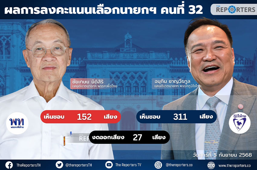 สภาฯ ไฟเขียว ‘อนุทิน‘ นั่งนายกฯ คนที่ 32 ด้วยคะแนน 311 เสียง ขณะที่ ’ชัยเกษม‘ ได้ 152 เสียง