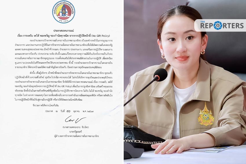 น.ส.แพทองธาร ชินวัตร นายกรัฐมนตรี ในฐานะผู้อำนวยการรักษาความมั่นคงภายในราชอาณาจักร (ผอ.รมน.) ลงนามประกาศเจตนารมย์ เรื่อง “การงดรับ งดให้ ของขวัญ ของกำนันทุกชนิด จากการปฎิบัติหน้าที่” เมื่อวันที่ 30 ต.ค. 67 โดยมีข้อความระบุว่า