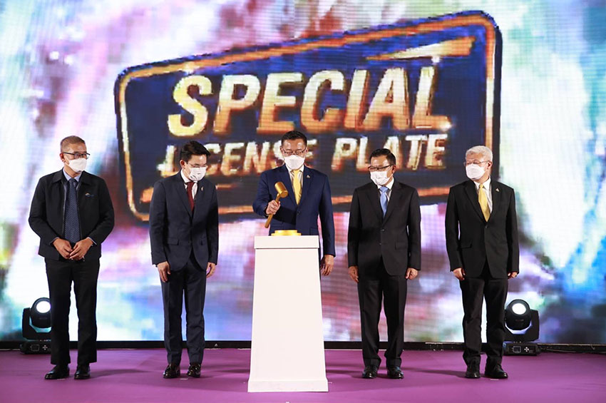 วันนี้ (7 เม.ย. 65) ณ โรงแรมพูลแมน คิง เพาเวอร์ กรุงเทพ (รางน้ำ) นายชยธรรม์ พรหมศร ปลัดกระทรวงคมนาคม เป็นประธานในพิธีเปิดการประมูลหมายเลขทะเบียนรถที่มีลักษณะพิเศษ สำหรับรถยนต์นั่งส่วนบุคคลไม่เกินเจ็ดคน เพื่อเปิดให้ผู้ที่สนใจร่วมทำประโยชน์แก่สังคมร่วมประมูลและได้ครอบครองป้ายทะเบียนรถที่มีเอกลักษณ์ ไม่เหมือนใคร พร้อมด้วยนายสรพงศ์ ไพฑูรย์พงษ์ รองปลัดกระทรวงคมนาคมและประธานกรรมการกองทุนเพื่อความปลอดภัยในการใช้รถใช้ถนน (กปถ.) คณะผู้บริหารกระทรวงคมนาคม หัวหน้าส่วนในสังกัดกระทรวงคมนาคม นายจิรุตม์ วิศาลจิตร อธิบดีกรมการขนส่งทางบก พร้อมผู้บริหารกรมการขนส่งทางบก ร่วมในพิธีการประมูลหมายเลขทะเบียนรถที่มีลักษณะพิเศษ สำหรับรถยนต์นั่งส่วนบุคคลไม่เกินเจ็ดคน ซึ่งจัดขึ้นครั้งแรกในวันที่ 7 เมษายน 2565 ณ โรงแรมพูลแมน คิง เพาเวอร์ กรุงเทพ (รางน้ำ) และทางเว็บไซต์ www.tabienrod.com โดย 5 หมายเลข ที่ได้รับความนิยมจากผู้ประมูล ได้แก่