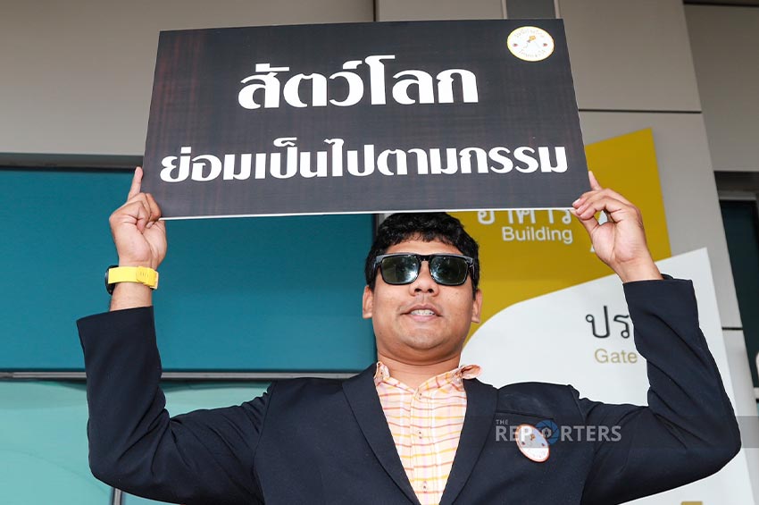กองเชียร์ส้ม บุกศาลรัฐธรรมนูญชูป้ายให้กำลังใจก้าวไกล ด้าน ศปปส.-แอดมินเพจก้าวไกลโกหกอะไร ชูป้ายสัตว์โลกย่อมเป็นไปตามกรรม