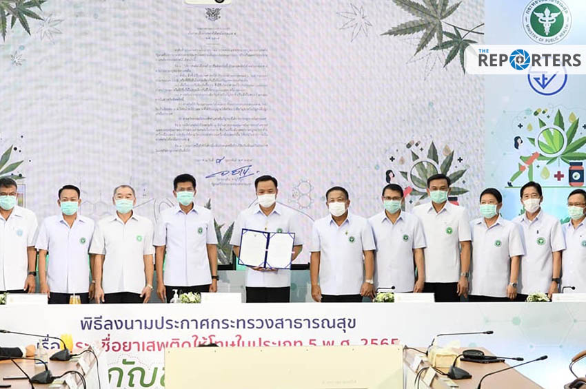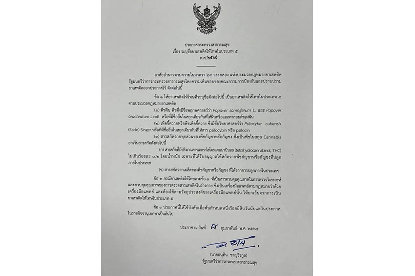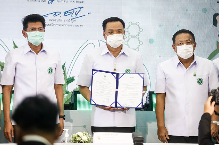 วันนี้ (8 ก.พ. 65) ที่กระทรวงสาธารณสุข (สธ.) จ.นนทบุรี นายอนุทิน ชาญวีรกูล รองนายกรัฐมนตรีและรัฐมนตรีว่าการ สธ. เป็นประธานในพิธีลงนามประกาศกระทรวงสาธารณสุข เรื่อง ระบุชื่อยาเสพติดให้โทษในประเภทที่ 5 พ.ศ.2565 ปลดกัญชาออกจากยาเสพติด หรือ ยส.5 หลังผ่านการพิจารณาจากคณะกรรมการป้องกันและปราบปรามยาเสพติด (บอร์ด ป.ป.ส.) ภายในงานมีคณะผู้บริหารกระทรวง ประชาชน และผู้สื่อข่าวร่วมงานเป็นจำนวนมาก