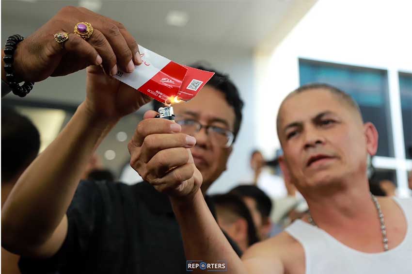 ต่อมา กลุ่มตัวแทนแท็กซี่ทวงคืนความยุติธรรม ได้นำเสื้อสีแดง และบัตรสมาชิกครอบครัวเพื่อไทย วางลงบนพาน ยื่นต่อ นายอนุสรณ์ เอี่ยมสะอาด โฆษกพรรคเพื่อไทย และได้ทำการเผาบัตรต่อหน้าโฆษก และสมาชิกพรรคเพื่อไทย พร้อมย้ำว่า ไม่ขอสนับสนุนพรรคเพื่อไทยอีกต่อไป