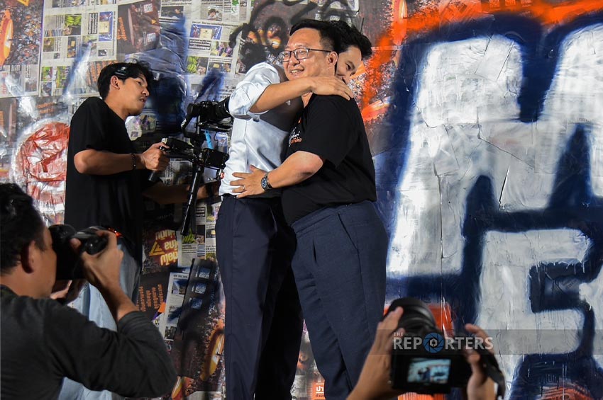ผู้สื่อข่าวรายงานว่าก่อนนายพิธาจะขึ้นเวที ได้สวมกอดนายปิยบุตร แสงกนกกุล เลขาธิการคณะก้าวหน้า และนายชัยธวัช ตุลาธน อดีตหัวหน้าพรรคก้าวไกลด้วย