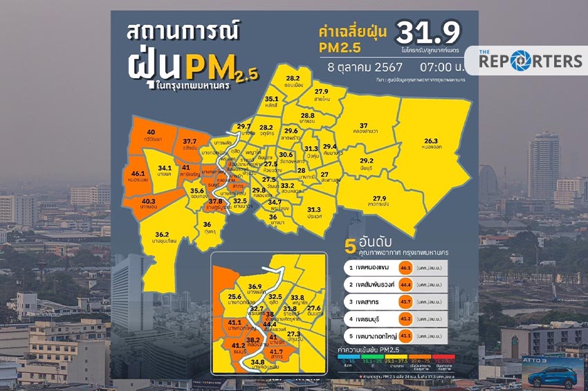 ศูนย์ข้อมูลคุณภาพอากาศกรุงเทพมหานคร รายงานสถานการณ์ฝุ่นละอองขนาดไม่เกิน 2.5 ไมครอน (PM 2.5) ของสถานีตรวจวัดคุณภาพอากาศของกรุงเทพมหานคร วันที่ 8 ตุลาคม 2567 เวลา 07.00 น. ค่าเฉลี่ย 24 ชั่วโมง ของฝุ่นละอองขนาดไม่เกิน 2.5 ไมครอน (PM 2.5) ตรวจวัดได้ 23-46.7 ไมโครกรัม/ลูกบาศก์เมตร (มคก./ลบ.ม.) เกินมาตรฐานอยู่ในระดับสีส้ม เริ่มมีผลกระทบต่อสุขภาพ (มาตรฐานไม่เกิน 37.5 มคก./ลบ.ม.) 16 พื้นที่ คือ