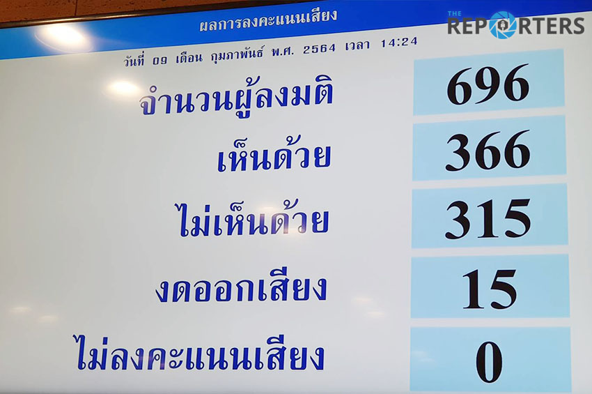 จนในที่สุด ที่ประชุมมีมติเสียงข้างมาก เห็นชอบ 366 เสียง ไม่เห็นด้วย 315 เสียง งดออกเสียง 15 เสียง ขณะเดียวกัน พรรคฝ่ายค้านได้เรียกร้องให้สำนักงานเลขาธิการสภาผู้แทนราษฎร เร่งติดประกาศผลการลงคะแนนโดยเร็ว