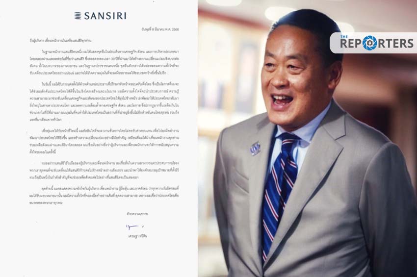 พร้อมแนบเอกสาร ระบุว่า “ถึงผู้บริหาร เพื่อนพนักงานในเครือแสนสิริทุกท่าน ในฐานะพนักงานแสนสิริคนหนึ่ง ผมได้แสดงจุดยืนในประเด็นทางเศรษฐกิจ สังคม และการบริหารประเทศมาโดยตลอดผ่านแพลตฟอร์มที่ชื่อว่าแสนสิริ ซึ่งตลอดระยะเวลา 30 ปีที่ผ่านมา ได้สร้างความเปลี่ยนแปลงเชิงบวกต่อสังคม ทั้งในบทบาทของภาคเอกชน และในฐานะประชาชนคนหนึ่ง จุดยืนดังกล่าวได้หล่อหลอมความตั้งใจที่จะขับเคลื่อนประเทศไทยอย่างแน่วแน่ และก่อให้เกิดความมุ่งมั่นที่จะลงมือขยายผลให้ขอบเขตกว้างยิ่งขึ้นไปอีก