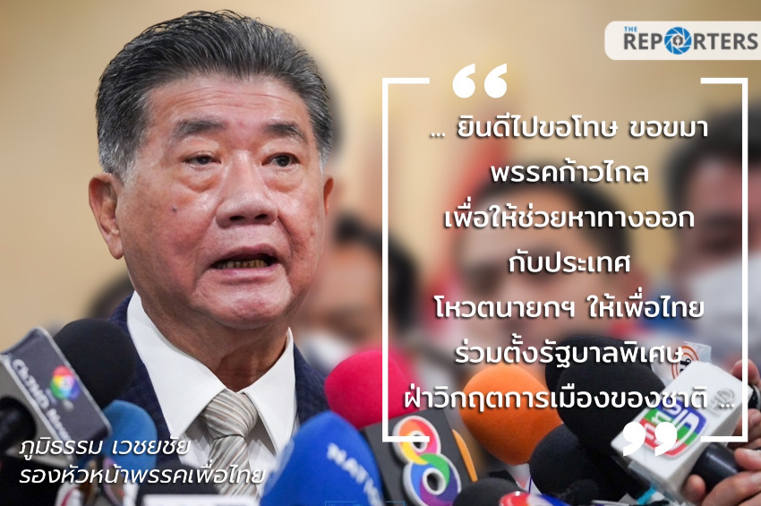 “ยินดีไปขอโทษ ขอขมา พรรคก้าวไกล เพื่อให้ช่วยหาทางออกกับประเทศ โหวตนายกฯให้พรรคเพื่อไทย ร่วมตั้งรัฐบาลพิเศษ ฝ่าวิกฤติการเมืองของชาติ พรรคเพื่อไทยจะทำให้ดีที่สุด ถ้าทำไม่ได้ เราจะบอกเอง” ภูมิธรรม เวชยชัย รองหัวหน้าพรรคเพื่อไทย”
