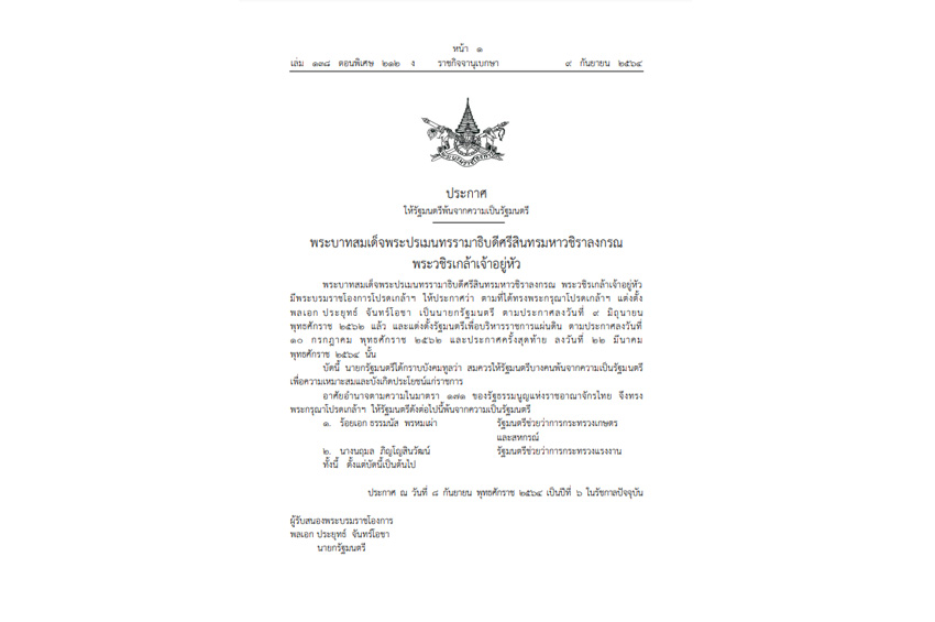 นอกจากนี้ เว็บไซต์ราชกิจจานุเบกษา ได้เผยแพร่ประกาศให้รัฐมนตรีพ้นจากความเป็นรัฐมนตรี โดยมีพระกรุณาโปรดเกล้าฯ ให้ ร้อยเอกธรรมนัส พรหมเผ่า รัฐมนตรีช่วยว่าการกระทรวงเกษตร และสหกรณ์ และนางนฤมล ภิญโญสินวัฒน์ รัฐมนตรีช่วยว่าการกระทรวงแรงงาน พ้นจากตำแหน่ง