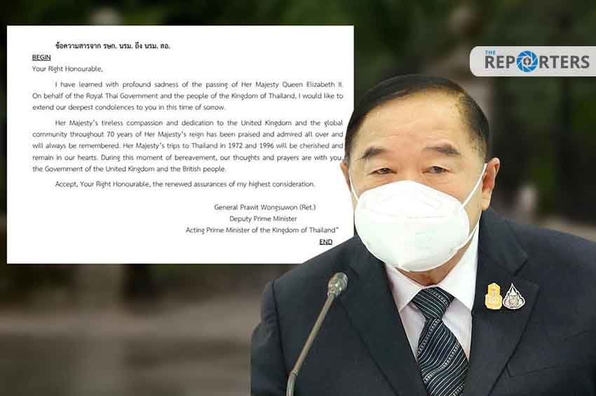 โฆษกรัฐบาลเปิดเผยข้อความสารแสดงความเสียใจของพลเอก ประวิตร ฯ รองนายกรัฐมนตรี รักษาราชการแทนนายกรัฐมนตรี ถึงนายกรัฐมนตรีสหราชอาณาจักร