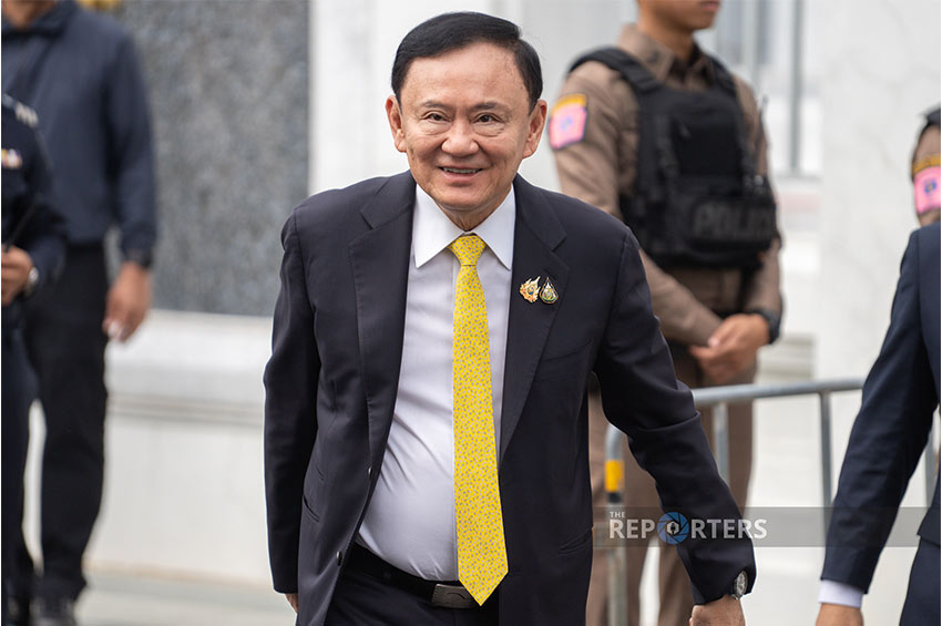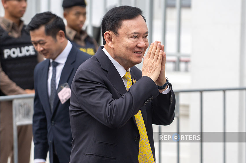 นายทักษิณ สวมเสื้อสูทสีดำ เนคไทสีเหลือง สีหน้ายิ้มแย้มพร้อมโบกมือทักทายสื่อมวลชน และทักทายกลุ่มคนเสื้อแดงที่มายืนรอให้กำลังใจ ก่อนที่จะเดินเข้าไปฟังคำสั่งศาล โดยเดินทางมาพร้อมกับนางสาวแพทองธาร ชินวัตร และนางสาวพินทองทา คุณากรวงศ์ ชินวัตร ลูกสาว ซึ่งมีรายชื่อเข้าร่วมรับฟังคำสั่งในวันนี้ในเวลา 10.00 น. ด้วย