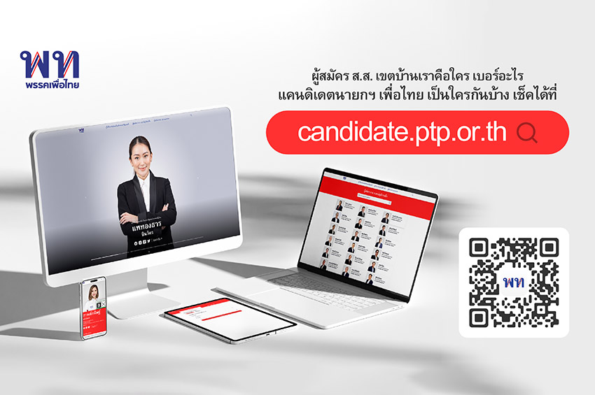 วันนี้ (11 เม.ย. 66) นายภูมิธรรม เวชยชัย รองหัวหน้าพรรคเพื่อไทย นายประเสริฐ จันทรรวงทอง เลขาธิการพรรคเพื่อไทย ในฐานะผู้อำนวยการการเลือกตั้ง พรรคเพื่อไทย และ นางสาวลิณธิภรณ์ วริณวัชรโรจน์ รักษาการโฆษกพรรคเพื่อไทย แถลงข่าวเปิดตัวเว็บไซต์ค้นหาผู้สมัคร https://candidate.ptp.or.th ให้ข้อมูลผู้สมัครสมาชิกสภาผู้แทนราษฎร (ส.ส.) แบบแบ่งเขตเลือกตั้ง ข้อมูลผู้สมัคร ส.ส. แบบบัญชีรายชื่อ และข้อมูลแคนดิเดตนายกรัฐมนตรี พรรคเพื่อไทย
