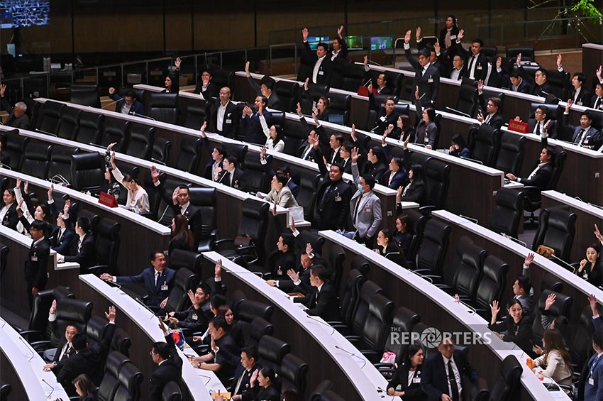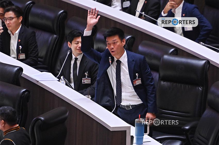 นายณัฐพงษ์ กล่าวต่อว่า นายกรวีร์ ได้พูดไว้ว่าพรรคภูมิใจไทย รักษาคำพูด พูดแล้วทำ ตนเองเห็นด้วยในกระบวนการที่ผ่านมา ก็ต้องยอมรับว่ากระบวนการจัดทำรัฐธรรมนูญฉบับใหม่ตามเอ็มโอเอนั้น ท่านก็มีส่วนสำคัญในการช่วยผลักดัน และประคับประคอง แต่สิ่งหนึ่งที่การลงมติในวันนี้ที่เป็นจุดสำคัญคำว่าพูด และความพยายามอย่างเต็มที่ในการทำให้รัฐธรรมนูญฉบับนี้เป็นจริงนั้น เชื่อได้หรือไม่ ตนเองได้ฟังการให้เหตุผลของเพื่อนสมาชิกว่า หากตัดเสียง สว. 1 ใน 3 ออกอาจจะทำให้กระบวนการในวาระ 3 ไม่เป็นความจริง ก็เลยเป็นเหตุผลที่เพื่อนสมาชิกบางส่วน โดยเฉพาะพรรคภูมิใจไทยจะให้ว่า ไม่งั้นจะเดินต่อไม่ได้ ตนเองจึงขอตั้งคำถามแบบนี้ว่า ถ้าในส่วนของพรรคประชาชน และพรรคเพื่อไทยในส่วนของพรรคฝ่ายค้าน พวกเราไม่สามารถที่จะยอมรับได้ ถ้าในกระบวนการจะทำรัฐธรรมนูญฉบับใหม่นั้นยังคง สว. 1 ใน 3 ไว้ ถ้าวันนี้เสียงโหวตส่วนใหญ่ในรัฐสภา กลับร่างของกรรมาธิการเสียงข้างมาก โดยไปดึงเอาเสียง สว. 1 ใน 3 กลับมา พวกตนเองไม่สามารถยอมรับให้กระบวนการจัดทำรัฐธรรมนูญฉบับใหม่นี้ เดินเข้าสู่วาระที่ 3 ได้จริง ๆ หนีไม่พ้นเป็นอย่างอื่น ถ้าผลโหวตในมาตรานี้กลับมติของรัฐบาล กลับร่างของกรรมาธิการเสียงข้างมาก จริง ๆ ในฐานะฝ่ายค้านเสียงข้างมาก ตนเองต้องร้องขอให้นายกรัฐมนตรี ยุบสภา