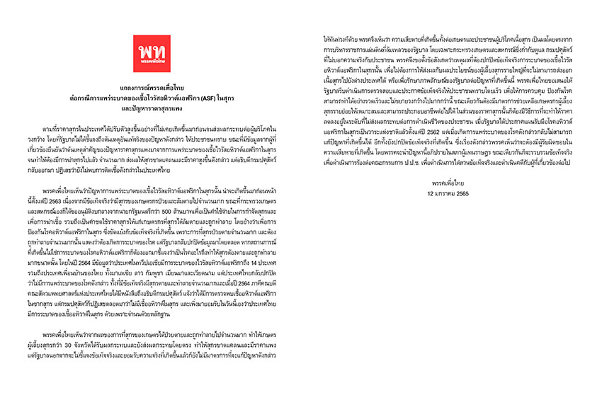 พรรคเพื่อไทยออกแถลงการณ์ กรณีราคาสุกรในประเทศปรับตัวสูงขึ้นจนส่งผลกระทบต่อผู้บริโภคในวงกว้าง ว่า รัฐบาลไม่ได้ชี้แจงถึงต้นเหตุอันแท้จริงของปัญหาดังกล่าว ให้ประชาชนทราบ ทั้งที่มีข้อมูลจากผู้ที่เกี่ยวข้องยืนยันว่าต้นเหตุสำคัญของปัญหาราคาสุกรแพงมาจากการแพร่ระบาดของเชื้อไวรัสอหิวาต์แอฟริกาในสุกร ทำให้ต้องมีการฆ่าสุกรไปจำนวนมาก ส่งผลให้สุกรขาดแคลนและมีราคาสูงขึ้น