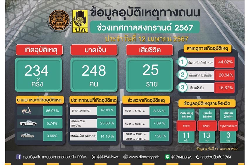 ศูนย์ป้องกันและลดอุบัติเหตุทางถนนช่วงสงกรานต์ เผย 7 วันอันตรายวันแรก สถิติลดลงเทียบกับ 3 ปีย้อนหลัง พบอุบัติเหตุ 234 ครั้ง สูงสุดที่ จ.สงขลา – เสียชีวิตรวม 25 ราย