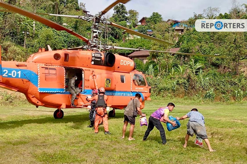 โดยล่าสุดในวันนี้ หลังจากประเมินสภาพอากาศว่ามีความปลอดภัยแล้ว ปภ. ได้ร่วมกับกองทัพบก (ทบ.) นำเฮลิคอปเตอร์ฯ KA-32 พร้อมด้วยเจ้าหน้าที่กู้ภัยประจำ ฮ.ปภ.32 “The Guardian Team” ออกปฏิบัติการให้ความช่วยเหลือผู้สูงอายุที่ติดอยู่ในบ้านชั้นเดียว ต.แม่สาย อ.แม่สาย จ.เชียงราย จำนวน 3 ราย และเป็นผู้ป่วยติดเตียง 1 ราย รวมถึงปฏิบัติภารกิจลำเลียงอาหารและน้ำดื่ม เพื่อส่งให้กับครู – นักเรียน จำนวน 140 ชีวิต ณ โรงเรียนสามัคคีพัฒนา บ้านม้งเก้าหลัง อ.แม่ฟ้าหลวง ซึ่งเป็นพื้นที่ที่สาธารณูปโภคถูกตัดขาด ทั้งน้ำ ไฟฟ้า และสัญญาณโทรศัพท์ เนื่องจากดินสไลด์ปิดทับถนน และเสาไฟฟ้าหัก