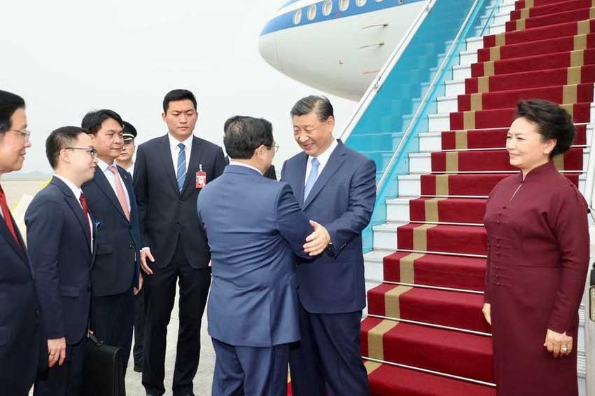 สีจิ้นผิงได้รับการต้อนรับอย่างอบอุ่นจากฝ่าม มิงห์ จิ๋งห์ และคณะเจ้าหน้าที่อาวุโสคนอื่นๆ ณ ท่าอากาศยาน โดยมีประชาชนชาวเวียดนามและชาวจีนจากทุกสาขาอาชีพมากกว่า 400 คน ร่วมโบกธงของทั้งสองพรรคการเมืองและสองประเทศเพื่อต้อนรับคณะผู้นำของจีน