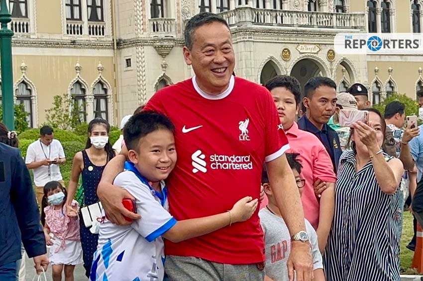 นายกฯ ลงสนามหญ้าหน้าตึกไทย เด็กรุมล้อมถ่ายรูป เผย ยังไม่ได้อ่าน ส.ค.ส. หลังถูกถามเรื่องเงินดิจิทัล วอลเล็ต