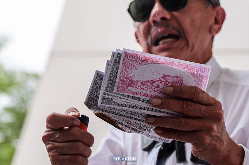 จากนั้นนายชูวิทย์ ได้แสดงออกเชิงสัญลักษณ์ โดยการนำแบงค์ แบงค์กงเต็ก ธนบัตรปลอม กระดาษเงิน และกระดาษทอง มาเผา พร้อมสาบแช่งคนที่รับเงินจากทุจริตคอรัปชั่นโครงการรัฐ