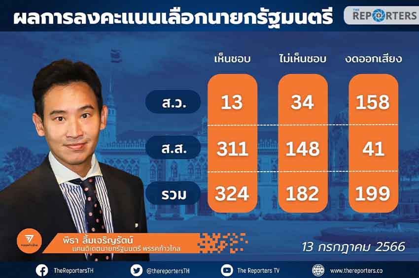 ผลการลงคะแนนเลือก ‘พิธา ลิ้มเจริญรัตน์’ นายกรัฐมนตรี ส.ว. งดออกเสียง 158 เสียง ไม่เห็นชอบ 34 เสียง เห็นชอบ 13 เสียง ขณะที่ ส.ส.เห็นชอบ 311 เสียง พรรคร่วมรัฐบาล 8 พรรคไม่แตกแถว ขณะที่ ส.ส.ไม่เห็นชอบ 148 เสียง งดออกเสียง 41 เสียง